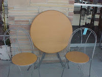 This wonderful table folds flat for easy storage when not in use. Great for small spaces, such as, kitchens, patios, children rooms, daycare and more. Light oak veneer with gray metal legs and back. Table measures 27 1/2" tall x 25" across / chairs 32" tall x 22" across. Heavy duty construction, will last for many years. Price $ 75.00.